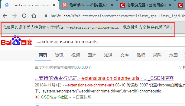 chrome谷歌瀏覽器:您使用的是不受支持的命令行標記:--extensions-on-chrome-urls ... [更多詳細]