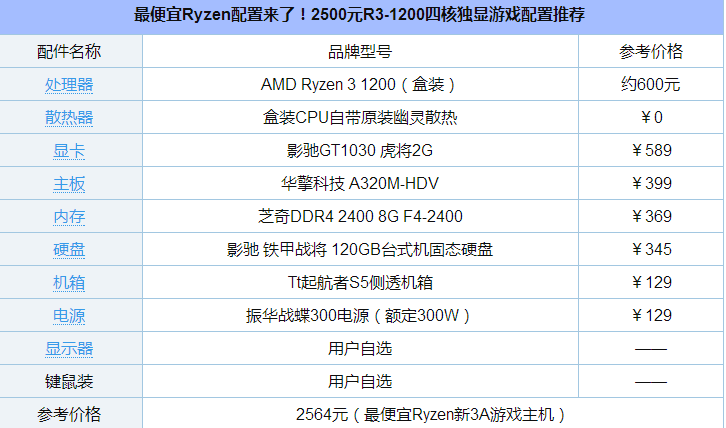 最便宜的2500元R3 1200四核獨顯搭配GTX1030游戲電腦配置推薦 ... [更多詳細]