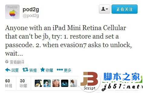 蜂窩版iPad mini2無法越獄整個進程卡在蘋果logo那里不動 ... [更多詳細]