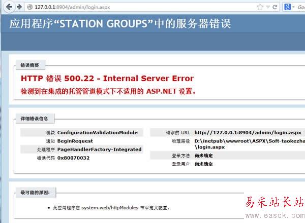 IIS7.5 檢測到在集成的托管管道模式下不適用的 ASP.NET設置 ... [更多詳細]
