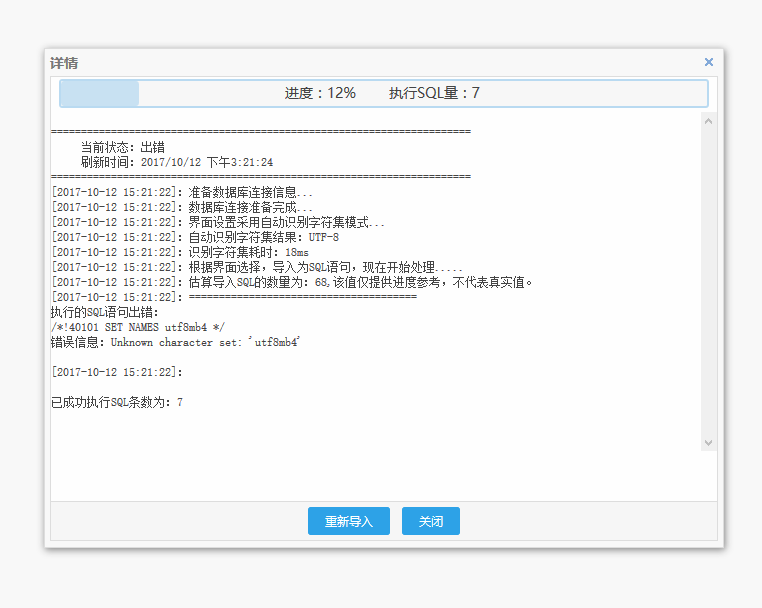導入MySQL數據庫提示”Unknown character set: utf8mb4″ ... [更多詳細]