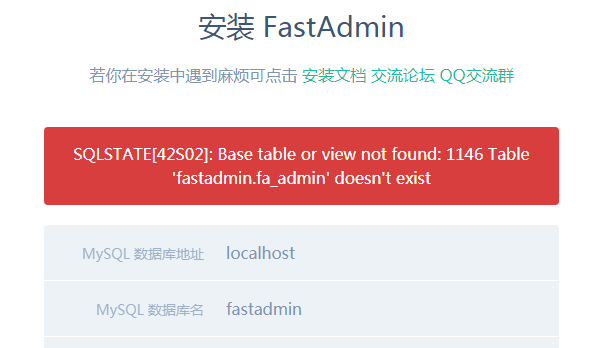 安裝FastAdmin時(shí)報(bào)1146 Table 'fastadmin.fa_admin' doesn't exist錯(cuò)誤 ... [更多詳細(xì)]