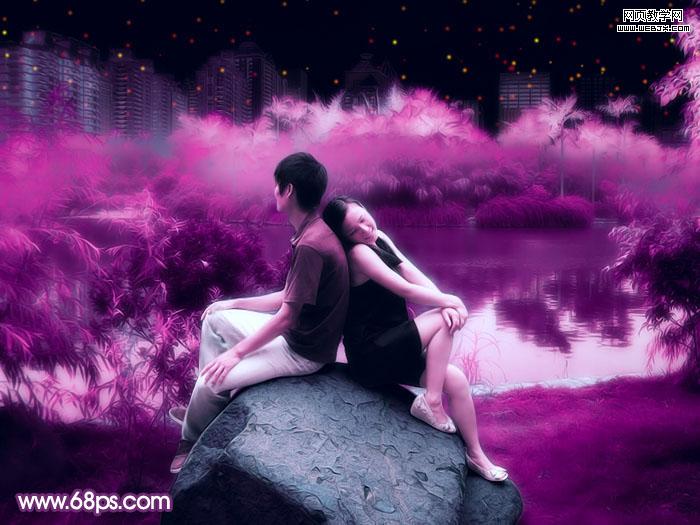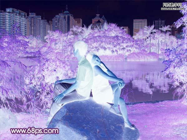 本教程色調(diào)以紫色為主。原圖素材較為明亮,不過經(jīng)過反相處理后,效果就非常接近夜景照片。只是圖片的局部有反白效果。需要慢慢去修復(fù)。