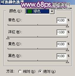 1、打開原圖素材,創(chuàng)建可選顏色調(diào)整圖層,對綠色進(jìn)行調(diào)整,參數(shù)設(shè)置如圖1,效果如圖2。