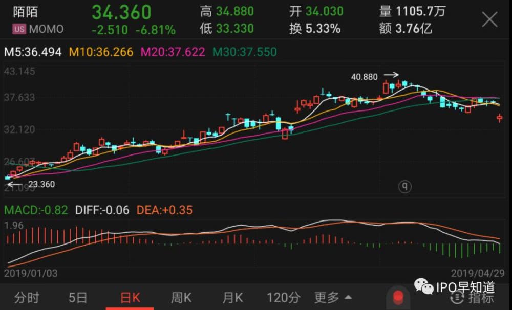 據IPO早知道消息,4月28日,被納斯達克上市的陌陌收購的社交APP探探,被媒體報道稱遭各大安卓應用商店下架。截至4月30日晨間收盤,陌陌科技股價下跌6.81%