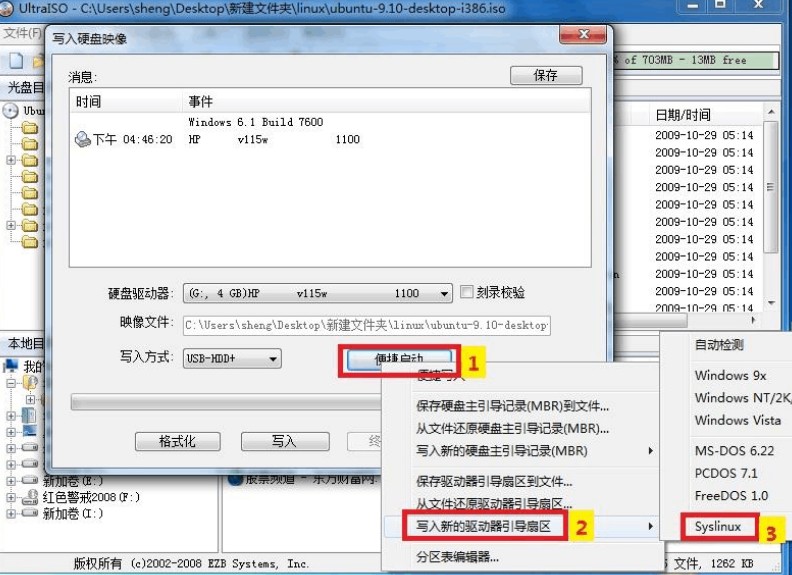 寫入方式我們默認即可,然后點擊“便捷啟動”,選擇到“寫入新的驅動器引導區”,再鼠標右移選擇到“Syslinux”項,點擊鼠標!如下圖: