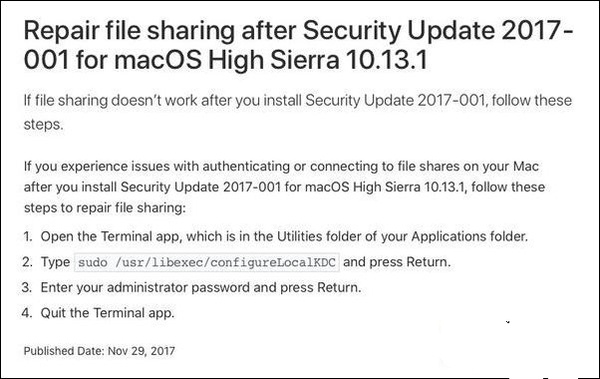 據了解,今天發布的安全補丁號為 2017-001 Security Update for macOS High Sierra 10.13.1。有用戶在更新后發現,多臺 Mac 間文件共享認證失敗,他們提到,“安裝補丁后就發現文件共享認證失敗。我在多臺 Mac 上都發現這個了問題。用訪達打開一個與其他 Mac (安裝了安全更新補丁)分享的文件,當你試著 connect as 時,用戶名和密碼都失敗了。”