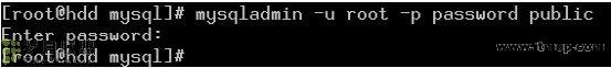 mysqladmin -u root -p password 密碼,這里的“密碼”為我們欲新設(shè)的密碼。如下圖所示,這里我們將root的密碼設(shè)置為“public” ,系統(tǒng)會提示我們輸入舊密碼(若是mysql剛安裝,則默認(rèn)密碼為空)。