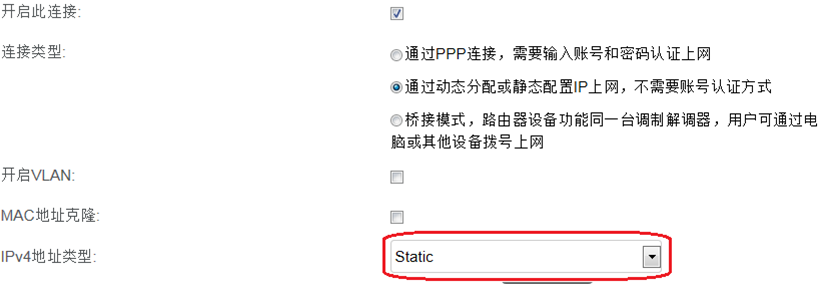 4.在“連接類型”處選擇“Static IP”模式,并設(shè)置所需的靜態(tài)IP參數(shù),以設(shè)置動態(tài)IP模式。