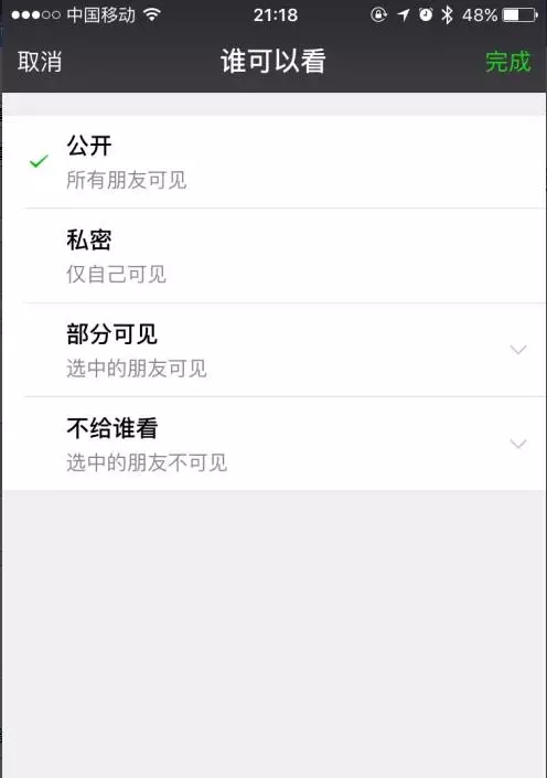 此前,發微信朋友圈只有根據分組選擇可見范圍的功能,用戶可以選擇公開(全部微信好友可見)、私密(僅自己可見)、部分可見(選中的朋友可見)以及不給誰看。