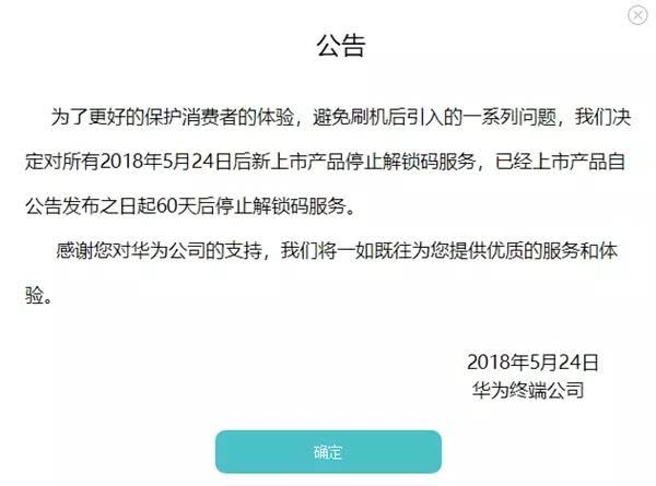華為在2018年的公告中稱,為了更好的保護消費者的體驗,避免刷機后引入的一系列問題,決定對所有2018年5月24日后新上市產品停止解鎖碼服務,已經上市產品自公告發布之日起60天后停止解鎖碼服務。