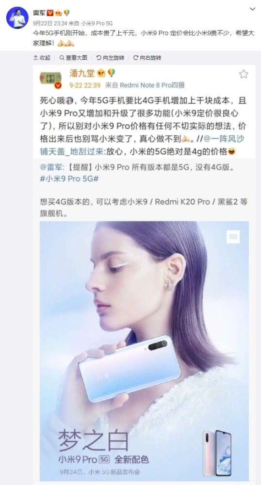 9月23日消息,對于小米即將要發(fā)布的第二款5G手機(jī),雷軍也是不遺余力的在微博上宣傳,其在最新的發(fā)言中表示,小米9 Pro 5G版的售價(jià)不會便宜,希望大家理解,同時(shí)該機(jī)所有版本都是5G,沒有4G版。