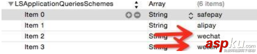 打開工程里的info.plist文件 添加LSApplicationQueriesSchemes數組并添加wechat 和 weixin字符串