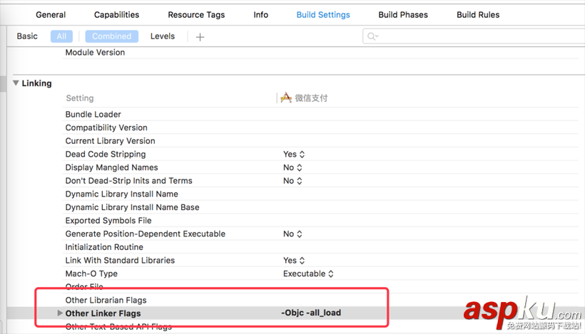 4.工程->build setttings -> 搜索other linker flags 添加-Objc -all_load 如下圖所示,不然運行工程會崩潰