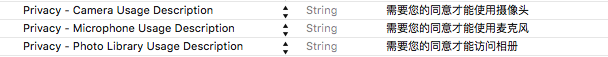 在iOS10上如果沒有上述配置就使用相機(jī)、相冊、麥克風(fēng)程序會閃退的。