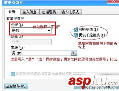 在新出來的對話框中,打開“設置”選項卡,“允許”中選擇“序列,在“來源”中輸入“男,女”,此處注意,“男,女”之間的逗號為英文逗號。然后勾上“忽略空置”和“提供下拉箭頭”。點擊確定即可;