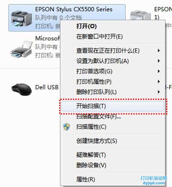 3.右鍵點擊打印機圖標,選擇“開始掃描”,如圖(2);
