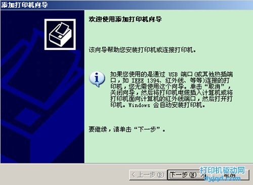 2.在彈出的打印機安裝向導窗口中,用鼠標單擊“ ”按鈕,如下圖所示。