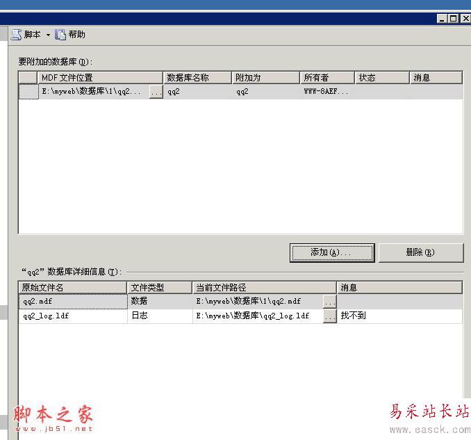 附加到剛剛那個 mdf的文件。注意看下面會提示 .ldf 文件找不到。