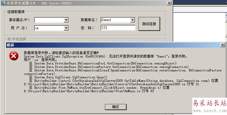 三、點擊測試連接按鈕,嘗試連接到服務器,如果連接成功,第二個和第三個GroupBox將變成可用狀態,且表名下拉對話框中將綁定該數據庫對應的所有表名;如果連接失敗,則拋出異常信息。連接成功如圖(三),連接失敗如圖(四)