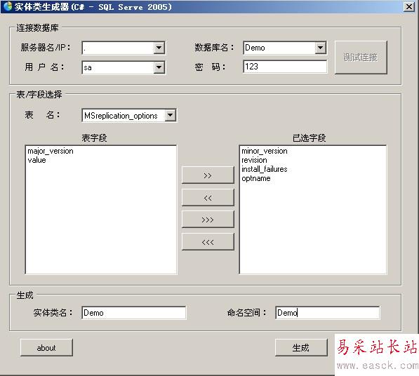 四、選中表名下拉對話框中的任意表名,則程序自動將該表中所有的字段填充到左側ListBox中,此時,你可用選擇需要生成實體類的字段,并移動到右側的ListBox中。如圖(五)