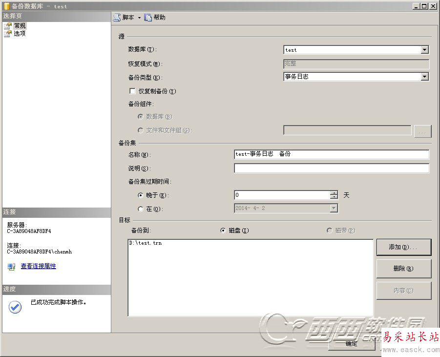 BACKUP LOG [test] TO  DISK = N'D:/test.trn' WITH NOFORMAT, INIT,  NAME = N'test-事務日志  備份', SKIP, NOREWIND, NOUNLOAD,  STATS = 10GO