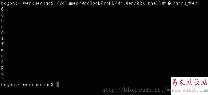 #!/bin/sh#定義方法一 數(shù)組定義為空格分割arrayWen=(a b c d e f)#定義方法二arrayXue[0]="m"arrayXue[1]="n"arrayXue[2]="o"arrayXue[3]="p"arrayXue[4]="q"arrayXue[5]="r"#打印數(shù)組長(zhǎng)度echo ${#arrayWen[@]}#for 循環(huán)遍歷 for var in ${arrayWen[@]};do echo $vardone#while循環(huán)遍歷i=0while [[ i -lt ${#arrayXue[@]} ]]; do echo ${arrayXue[i]} let i++done執(zhí)行結(jié)果如下: