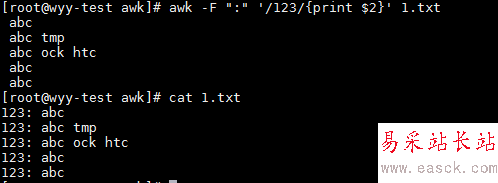 awk -F ":" '/123/{print $2}' 1.txt #以":"為分隔符打印1.txt中匹配123的那一行中,第二列的內容
