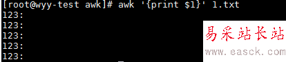 awk '{print $1}' 1.txt #打印1.txt的第一列內容,在不指定分割符的情況下,awk默認使用空白做分割符