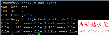 #!/bin/bashfile=$1if [[ $# -lt 1 ]]then echo "Usage: $0 please enter you filepath" exitfiwhile read -r f1 f2 f3 #將文件內容分為三列do echo "file 1:$f1 ===> file 2:$f2 ===> file 3:$f3" #按列輸出文件內容done < "$file"