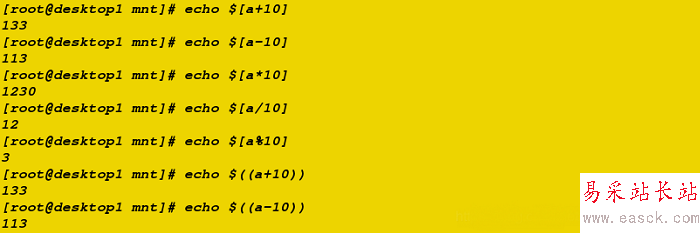 echo $[a+10]echo $[a-10]echo $[a*10]echo $[a/10]echo $[a%10]echo $((a+10))echo $((a-10))
