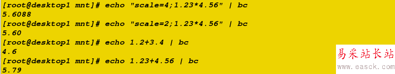 echo "scale=4;1.23*4.56" | bc ##scale表示小數(shù)點(diǎn)后幾位echo "scale=2;1.23*4.56" | bcecho 1.2+3.4 | bcecho 1.23+4.56 | bc