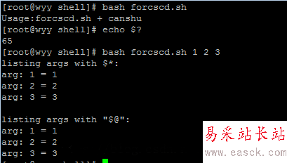 #!/bin/bashnumber=65 #定義一個退出值index=1 #定義一個計數器if [ -z "$1" ];then #對用戶輸入的參數做判斷,如果未輸入參數則返回腳本的用法并退出,退出值65 echo "Usage:$0 + canshu" exit $numberfiecho "listing args with /$*:" #在屏幕輸入,在$*中遍歷參數for arg in $* do echo "arg: $index = $arg" let index+=1doneechoindex=1 #將計數器重新設置為1echo "listing args with /"/$@/":" #在"$@"中遍歷參數for arg in "$@"do echo "arg: $index = $arg" let index+=1done