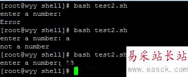 #!/bin/bashread -p "enter a number: " number #提示用戶輸入數字if [ -z $number ];then #判斷用戶是否輸入,如果未輸入則打印error echo "Error" exitelse jieguo=`echo "$number*1" | bc ` #把用戶的輸入值和1相乘,交給bc做運算 if [ $jieguo -eq 0 ];then #判斷計算結果是否為0,為0則說明number非數字(字符串和0相乘結果為0) echo "not a number" exit fifi