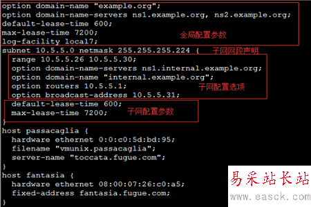 標準的DHCP配置文件包括全局配置參數、子網網段聲明、地址配置選項以及地址配置參數: