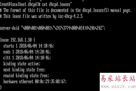 在服務端上查看/var/lib/dhcpd/dhcpd.leases~文件可知租用時間等信息: