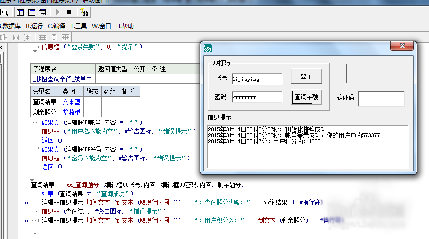 11、為這個圖片框添一個驗證碼,為了更好演示, 這里現(xiàn)添加一個按鈕,用于識別驗證碼,添加下面的代碼即可!演示一下,成功了,扣了15積分!