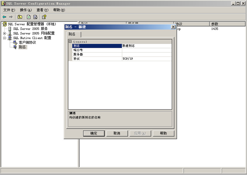 SQL2005沒有像SQL2000一樣的客戶端網絡實用工具,基本上SQL2005算是把SQL2000里面的名字都改了,在網上找資料也沒找到,只能一點點的試,終于發現了一個別名,欣喜的給我希望的“別名”。