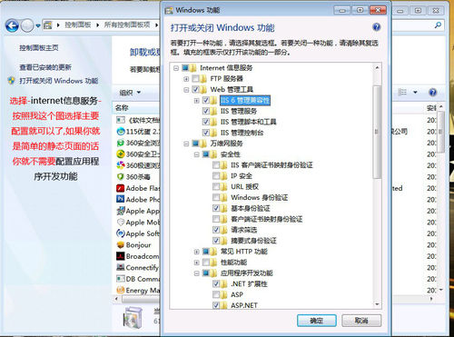 彈出一個窗口,請按照上面選擇這些功能,VS2005 中,如果要調試站點的話,必須有“Windows身份驗證” “摘要式身份驗證” 是使用 Windows 域控制器對請求訪問 Web 服務器上內容的用戶進行身份證?!盎旧矸蒡炞C” 是要求用戶提供有效的用戶名和密碼才能訪問內容。要調試 ASP.net 當然要安裝IIS支持 ASP.net 的組件了。選擇好了后點擊確定就等他安裝好。