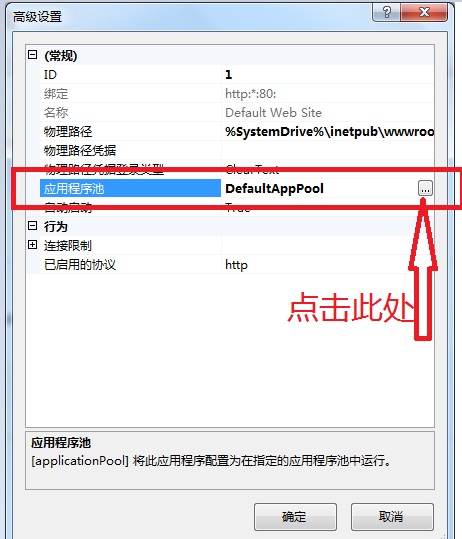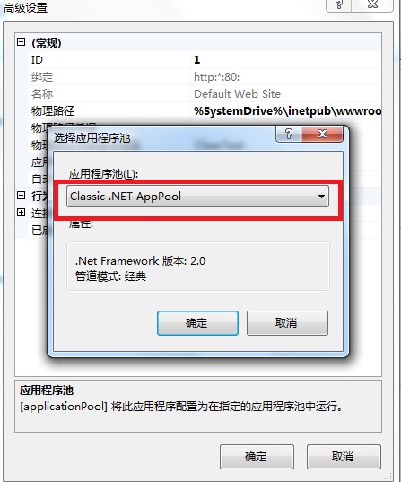 控制面板--系統和安全--管理工具--Internet信息服務(IIS)管理器,打開IIS管理器。選中左側的默認網站(也就是“Default Web Site“這個網站),單擊右側的高級設置,將應用程序池設置為Classic.NETAppPool。