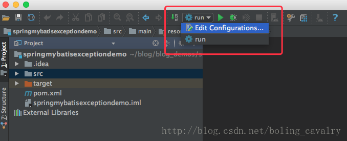 現在已經在Intellij idea中打開了一個web工程(最好是maven工程),并且已部署到tomcat上去了,點擊下圖紅框中的”run”按鈕,在下拉菜單中點擊“Edit Configurations…“: