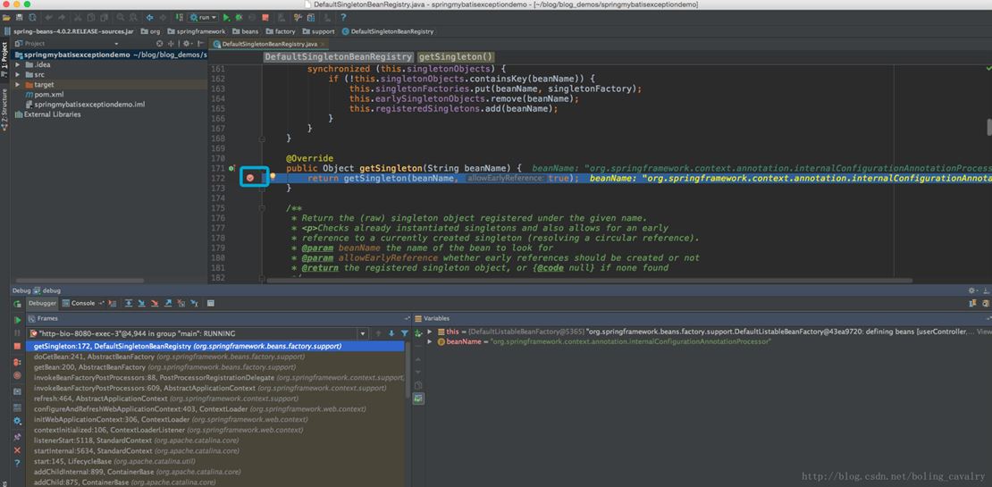 現在在項目中打斷點,如果執行到了斷點位置,就會進入debug狀態,如下圖,我是在spring的源碼中打了個斷點,項目啟動的時候就會進入了:
