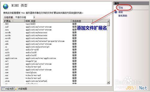 2.“MIME類型”功能用來配置服務器可以當靜態文件的文件類型和與之相關聯的應用程序。文件類型列表按a-z的字母順序排序,點擊“添加”進行新的文件類型rmvb擴展名的添加。