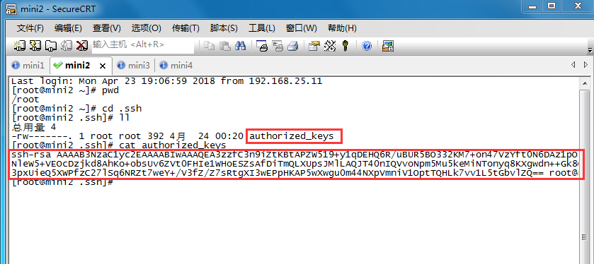 機器2的/root/.ssh目錄下的authorized_keys文件保存著剛才機器1傳過來的公鑰(可用cat命令查看,并對比機器1上的公鑰,是一樣的)
