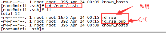 到/root/.ssh目錄下可看到剛剛那條命令生成的私鑰和公鑰
