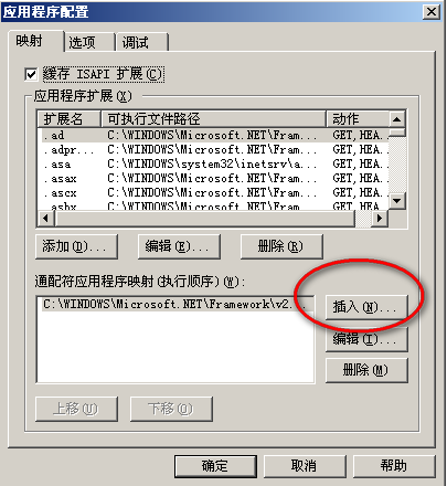 3、點擊下面窗口中的“插入”按鈕,新增通配符映射。可執行文件為“C:/Windows/Microsoft.NET/Framework/v4.0.30319/aspnet_isapi.dll”,取消勾選“確認文件是否存在”點擊確定