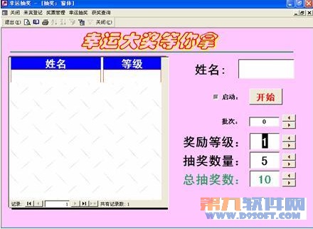 通過獎勵等級組合框控制抽獎等級,通過抽獎數量組合框控制每批次抽獎數量,通過總抽獎數組合框控制總抽獎數。當獎勵等級分別為一、二、三等獎時,抽獎數量和總抽獎數默認值分別為5、10、10和10、30、50。各組合框的具體數值也可以通過上下箭頭控制。抽獎界面如圖2。