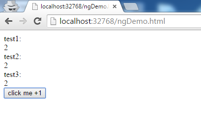 1 2 3 4 5 6 7 8 9 10 11 12 13 14 15 16 17 18 19 20 21 22 23 24 25 26 27 28 <!DOCTYPE html> <html ng-app="ngDemo"> <head> <title></title> <script src="http://libs.baidu.com/jquery/1.10.2/jquery.min.js"></script> <script src="//www.w3cschool.cc/try/angularjs/1.2.5/angular.min.js"></script> <script type="text/javascript"> $(function() { $('#btn').on('click',function(e) { $('#dv2').text(Number($('#dv2').text())+1);//jquery+angular實現 $('#dv3').text(Number($('#dv3').text())+1);//純jquery實現 }); }); var app=angular.module('ngDemo',[]); app.controller('ngCtrl',['$scope',function ($scope) { $scope.test1=0; $scope.test2=0; }]); </script> </head> <body ng-controller="ngCtrl"> test1:<div id="dv1">{{test1}}</div><!--純angular實現--> test2:<div id="dv2" ng-bind="test2" ng-model="test2"></div> test3:<div id="dv3">0</div> <button id="btn" ng-click="test1=test1+1">click me +1</button> </body> </html>代碼