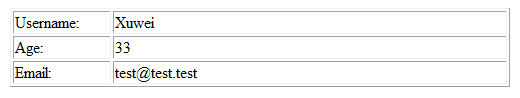 <!-- 創建需要展現UserInfo的實例(用于測試數據) --> <% UserInfo user = new UserInfo(); user.setUserName("Xuwei"); user.setAge(33); user.setEmail("[email protected]"); pageContext.setAttribute("userinfo", user); %> <!-- 給標簽設置user屬性綁定要展現的UserInfo對象 --> <cc:showUserInfo user="${pageScope.userinfo }" />