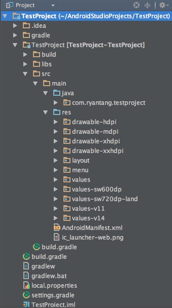 展開后可以看到Android Studio的目錄結構,和Eclipse的工程還是有一點區別的: